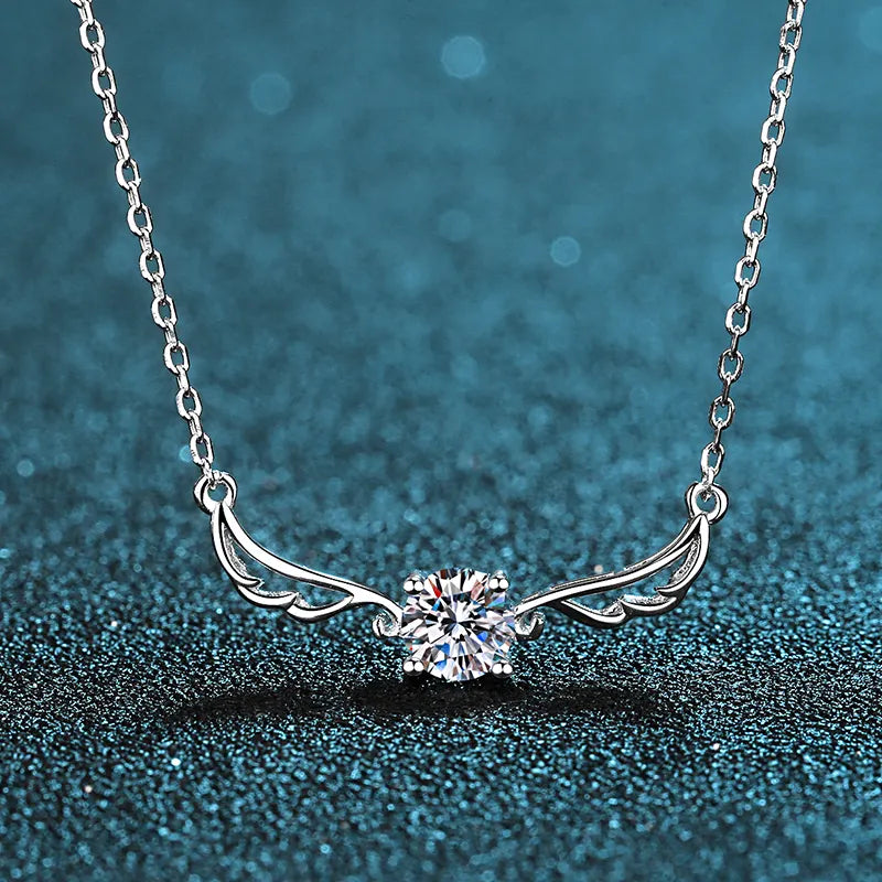 Let your style take flight with this enchanting 0.5 ct moissanite pendant. Set between graceful wing motifs, the brilliant stone radiates celestial beauty. Certified by GRA for authenticity, this piece combines elegance and sparkle, making it perfect for everyday magic or special occasions.